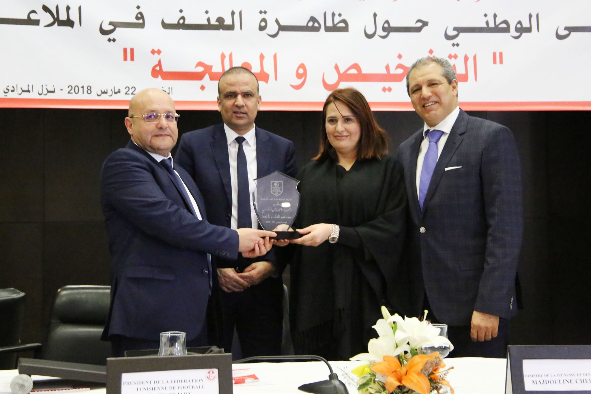 أشرفت وزيرة شؤون الشباب والرياضة ماجدولين الشارني صباح يوم الخميس 22 مارس 2018 على افتتاح فعاليات الملتقى الوطني حول "ظاهرة العنف في الملاعب : التشخيص والمعالجة" الذي نظمته الرابطة الوطنية لكرة القدم المحترفة بحضور كاتب الدولة للرياضة عماد الجبري ورئيس الجامعة التونسية لكرة القدم وديع الجريء ورئيس الرابطة الوطنية لكرة القدم المحترفة محمد العربي وعدد من مسؤولي الجمعيات الرياضية والإعلاميين.