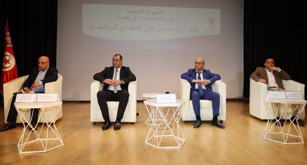 عقدت وزارة الشباب والرياضة اليوم الثلاثاء 07 افريل 2026 يوما إعلاميا حول قطاع الرياضة بدار الجامعات الرياضية بحضور المكلف بتسيير الإدارة العامة للرياضة السيد احسان الزوق ومدير الهياكل الرياضية السيد محمد علي النفزي ومدير الشؤون القانونية السيد خالد النجيمي وكاهية مدير إطارات ورياضيي النخبة السيد محمد علي الشعباني ونوفل بالحاج رحومة مدير البناءات والتجهيز الى جانب عدد من إطارات الوزارة وثلة من الصحفيين المختصين في الشأن الرياضي، تم خلالها تقديم عرض حول تدخلات الدولة لفائدة الهياكل الرياضية بعنوان 2026 وتوجهات الوزارة لتطوير الرياضة ودعم رياضيي النخبة عقبها فتح باب النقاش والاجابة عن تساؤلات الصحفيين.
